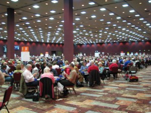 Back posting from Reno. After a couple of days at a national, you enter a bit of a bubble. As I mentioned in a previous post, you have over 3,000 people confined to a single space where bridge is the one and only topic. All day long, anywhere you go in the hotel, including the fitness center, you continually overhear conversations starting with the phrase, “You hold…”. Being in this artificial environment does mess with your mind, and I have actually had to use in which event I’m playing in order to figure out what day of the week it is.