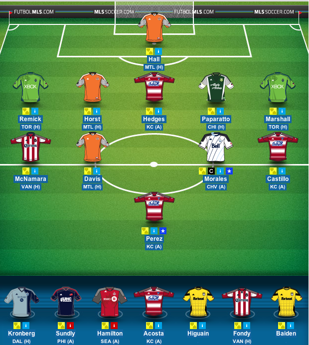 In most weeks, each team gets to make two transfers for free. Additional transfers will cost four points. From my week one team, both Landon Donovan and Federico Higuain are off this week. Donovan will come back in week three with an away game at RSL, followed by another off week. As much as I am a fan of Landon’s, that’s too much to keep. So transfer one was Landon out, replaced by Vancouver’s Pedro Morales, who had a great game against the Red Bulls last week.